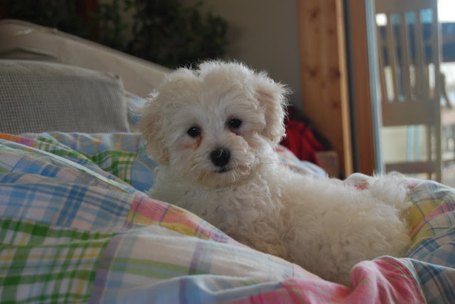 Cooper is 10 weeks old (shares a birthday with my sister-in-law, Kristy) and is a Maltipoo (maltese & poodle mix) we found from someone selling them here in Rockford. He is so sweet and the girls are already in love with him.